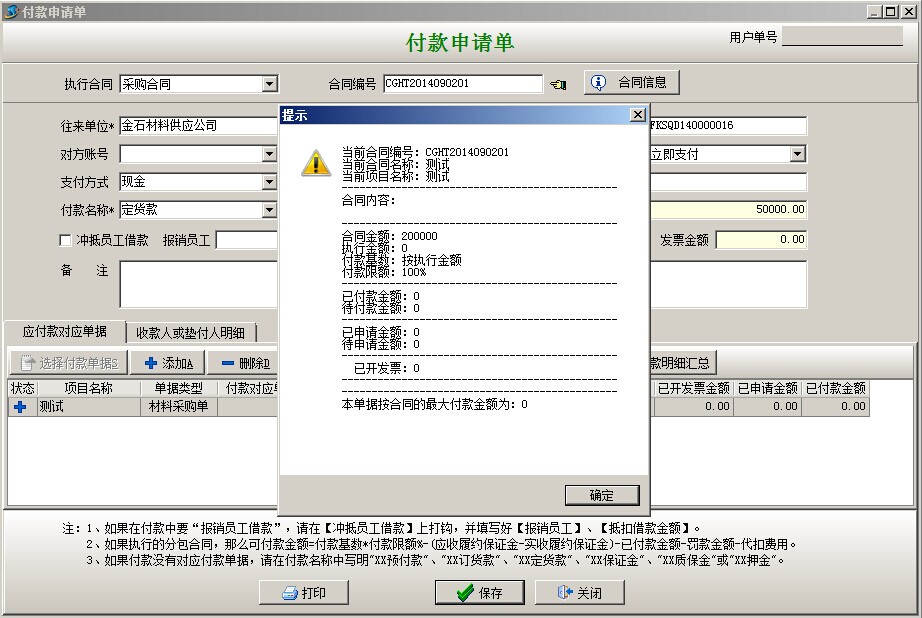 備注:上圖提示為預防超額付款的合同明細提示,點確定即可。