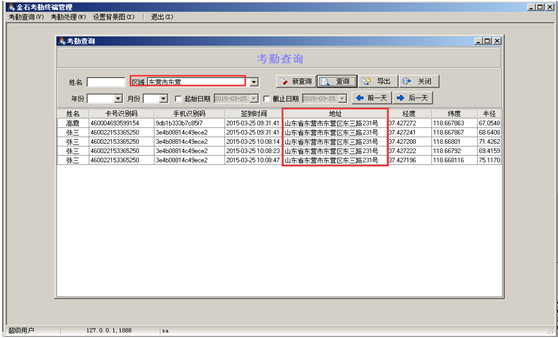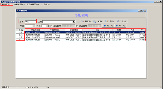 手機(jī)簽到成功之后,在服務(wù)器端登錄系統(tǒng)之后,有查看權(quán)限的人可以進(jìn)入“手機(jī)考勤管理終端”查看員工的簽到信息并進(jìn)行管理。如需查看考勤信息可點(diǎn)擊“考勤查詢”的按鈕,可按照“姓名”進(jìn)行查詢,或者輸入被授權(quán)的“地區(qū)名稱”進(jìn)行查詢,輸入“姓名”查詢到的是對應(yīng)的員工的簽到信息,輸入地區(qū)名稱查詢到的是在對應(yīng)地區(qū)內(nèi)簽到的所有員工的查詢信息,如圖: