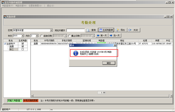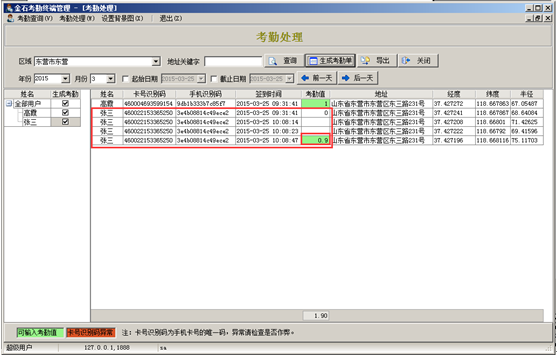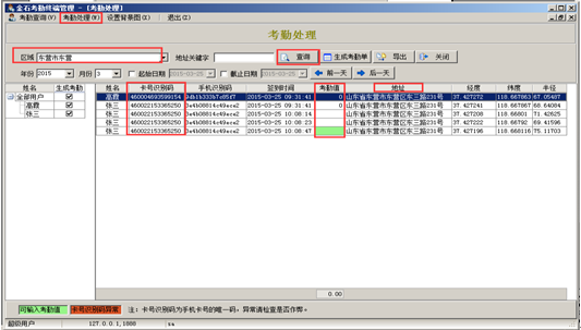輸入“區(qū)域名稱”或者“關(guān)鍵字”,點(diǎn)擊“查詢”按鈕可查詢考勤信息,“卡號識(shí)別碼”是手機(jī)卡號的唯一識(shí)別碼,當(dāng)“卡號識(shí)別碼”顯示異常時(shí)可檢查是否存在作弊行為,系統(tǒng)自動(dòng)定位用戶的簽到地址,若簽到信息正??筛鶕?jù)簽到時(shí)間在“考勤值”輸入框中輸入對應(yīng)的考勤值(若同一用戶一天內(nèi)多次考勤只在最后一次輸入考勤值),如圖: