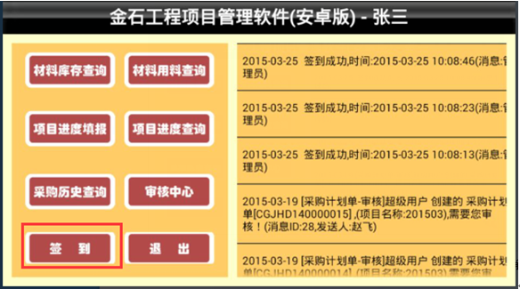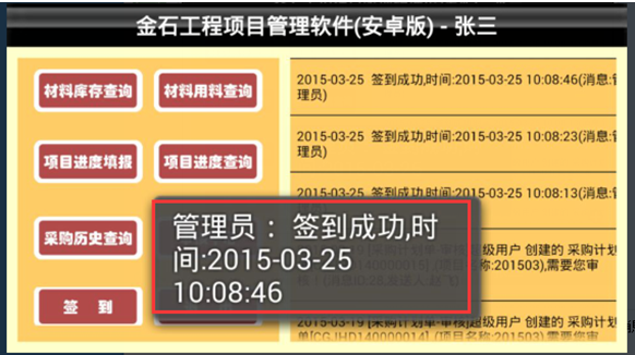 這樣用戶名為test的用戶登錄系統(tǒng)進(jìn)入到“手機(jī)考勤管理終端”就可以查看并處理“東營市東營區(qū)”的手機(jī)考勤的信息。項(xiàng)目上的工作人員在用手機(jī)客戶端簽到的時(shí)候,登錄系統(tǒng),點(diǎn)擊“簽到”的按鈕,簽到成功之后系統(tǒng)提示“簽到成功”并顯示簽到時(shí)間,如圖: