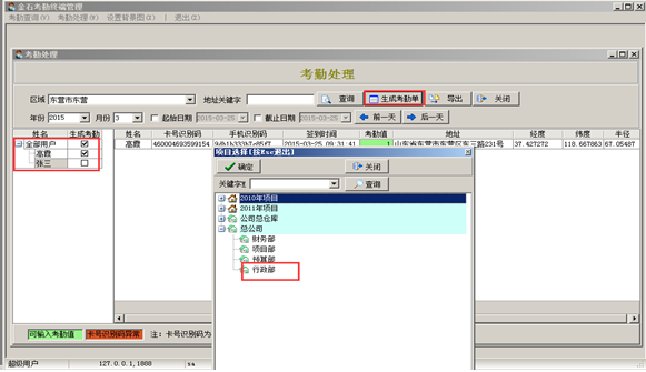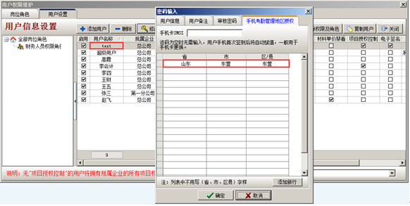 項(xiàng)目上的工作人員不方便到公司簽到,可在安卓手機(jī)上下載并安裝好金石軟件的手機(jī)客戶端之后登錄手機(jī)客戶端進(jìn)行簽到。需要查詢并處理考勤信息的用戶在查詢信息前要先進(jìn)入到“系統(tǒng)維護(hù)”-“用戶管理權(quán)限設(shè)置”里面進(jìn)行“手機(jī)考勤管理地區(qū)授權(quán)”的設(shè)置,被授權(quán)的用戶就可以查看并處理被授權(quán)地區(qū)的手機(jī)考勤的信息。如圖: