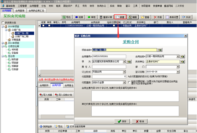 第三步,選擇完成之后會(huì)將信息調(diào)入到合同內(nèi)容明細(xì)中,如圖
