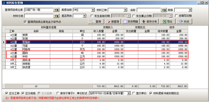 采購(gòu)入庫(kù)的材料,在單據(jù)添加并保存完成后可在項(xiàng)目庫(kù)存中查詢(xún)到,如圖: