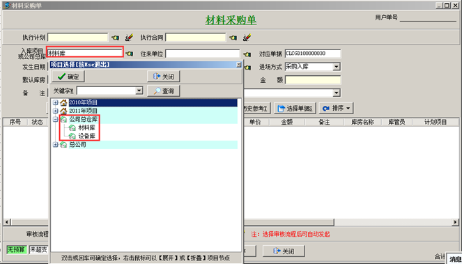 注:如果工程項(xiàng)目材料采購(gòu)流程規(guī)定材料是入到項(xiàng)目的倉(cāng)庫(kù)中則選擇對(duì)應(yīng)的項(xiàng)目上的倉(cāng)庫(kù),如果采購(gòu)回來(lái)的材料是入到公司總庫(kù),則選擇“入庫(kù)項(xiàng)目”為“公司總倉(cāng)庫(kù)”,如圖: