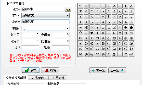 首先在工地項目管理系統中材料維護新建一個名稱為結賬優惠的虛擬材料,如下圖: