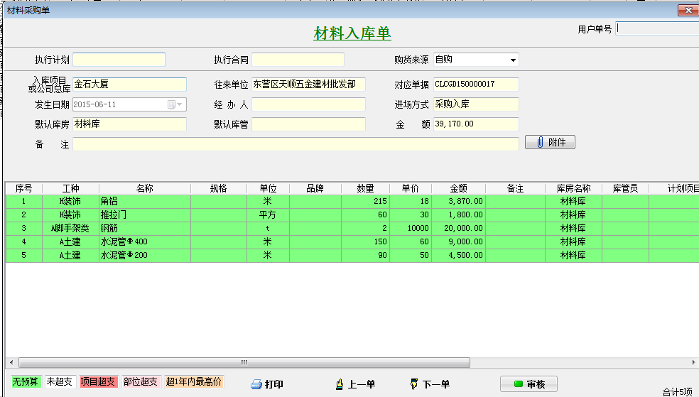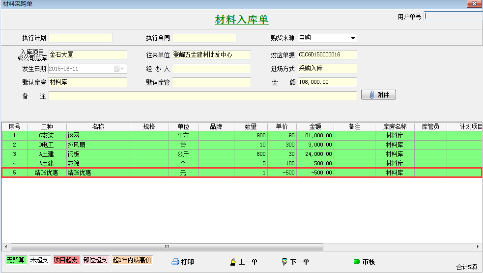 如果有優惠金額時,在工地項目管理系統中填寫采購入庫單時添加這個結賬優惠的虛擬材料,金額為優惠金額的負數