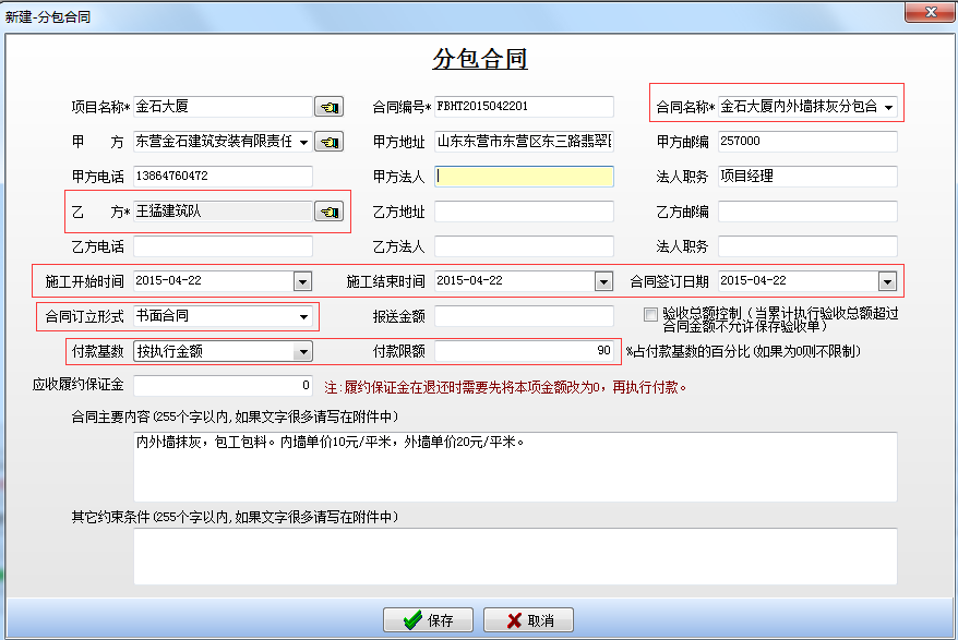 上圖帶紅框的注意填寫正確,其中帶*為必填項。尤其注意【付款基數】、【付款限額】這些項都會直接影響到該合同的待付款。