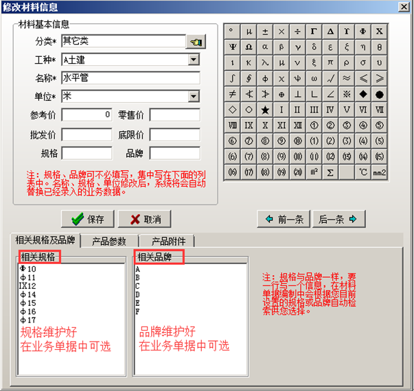 點擊“新增”或“修改”的按鈕來編輯材料信息,在進行材料基本信息編輯時,可進行相關規(guī)格以及相關品牌的維護,對應的規(guī)格及品牌維護完成在系統(tǒng)的業(yè)務單據中可選,這樣可避免同種材料在系統(tǒng)中生成多條記錄的麻煩。如圖: