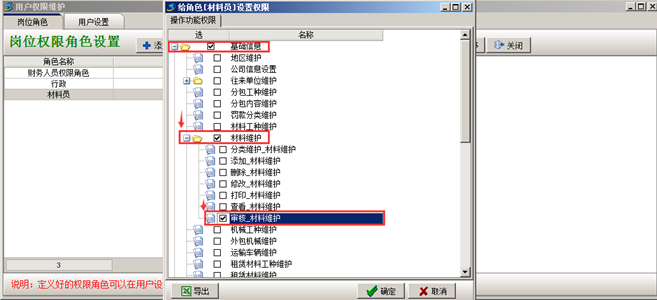 在“系統(tǒng)維護”-“用戶管理權限設置”給具有材料審核權限的用戶分配權限,如圖: