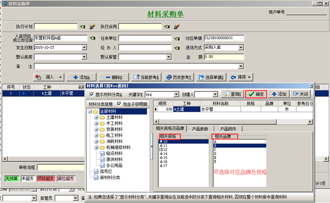 (1)、相關規(guī)格和品牌設置好后,在做材料相關單據時系統(tǒng)會自動列出以供選擇。