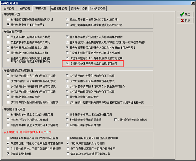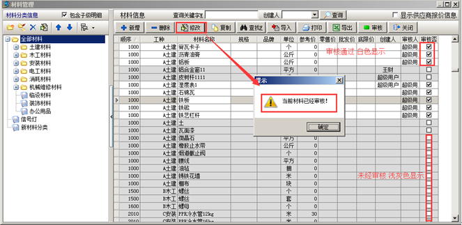 在金石工程管理軟件中可對添加的“材料信息”進行審核(此功能為可選功能)。如圖:
