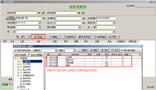 審核通過的“材料信息”可在系統(tǒng)業(yè)務單據中可用,如圖: