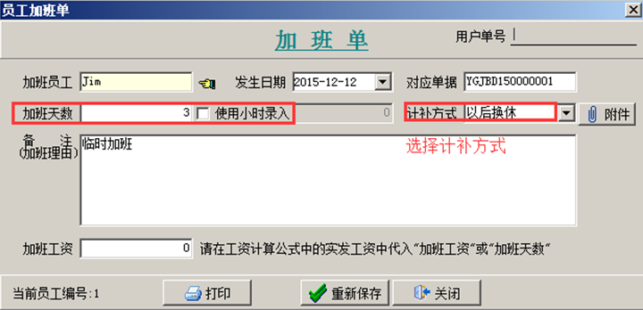 工程管理軟件中添加員工加班單的基礎(chǔ)信息,輸入加班天數(shù)(如果加班是以小時計算則在“使用小時錄入”的復選框打鉤),選擇“計補方式”為“以后換休”。如圖: