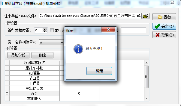 本地帶有員工本月五金和節日獎字段的表格中所對應的列分別是“B”列和“C”列,列名對應好之后,點擊“確定”進行替換,導入并替換完成之后會彈出“導入完成”的對話框,如圖: