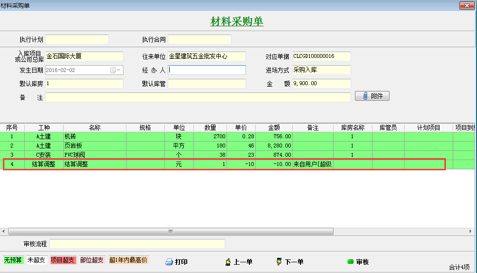 項目管理軟件在成本結算時,供應商總會對一些價格進行一些優惠或者對總金額零頭進行抹去,這時就需要用到結算金額調整。該功能一般適用于單據已審核,或者需要掛賬結算時使用。