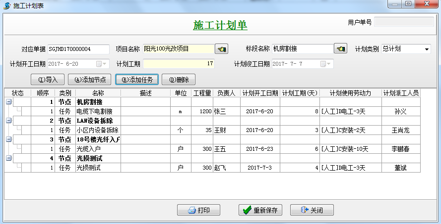 新建【施工計劃單】,先添加節點,在添加任務,輸入工程量、負責人、計劃開工日期等信息
