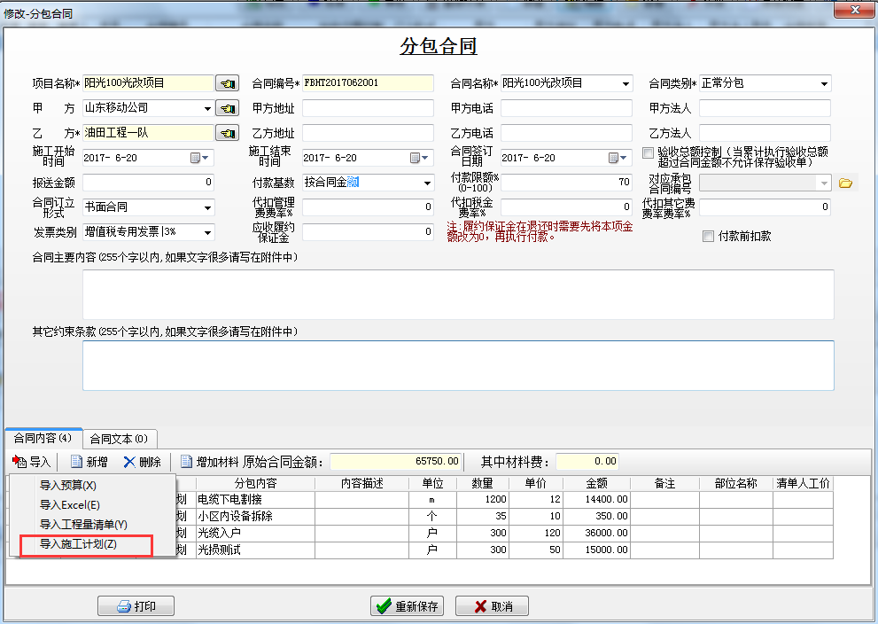 建立分包合同,導入施工計劃的內容