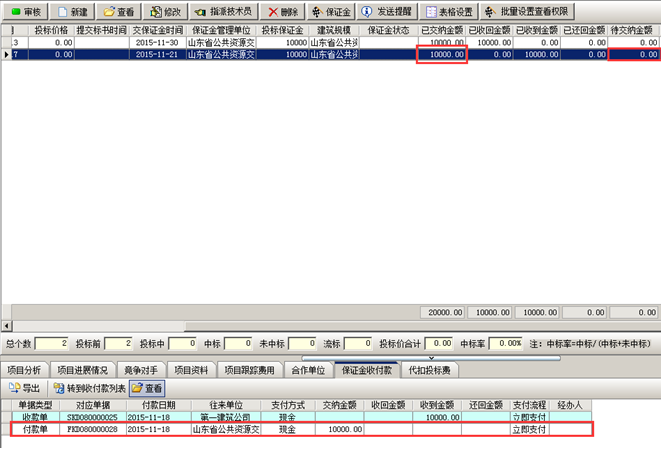 付款完成,工程管理軟件中待交納金額減少,已交納金額增加,并且可查看到對應項目的保證金付款記錄,如圖所示: