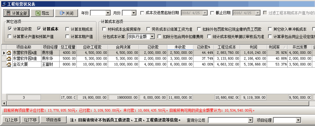 可查詢出項(xiàng)目(包括所有項(xiàng)目、某一子公司的項(xiàng)目、某資質(zhì)承接的項(xiàng)目、某項(xiàng)目經(jīng)理承包的項(xiàng)目、某開工年度的項(xiàng)目)結(jié)算進(jìn)度、應(yīng)收工程款、已收款、未收款、工程總成本、完成產(chǎn)值、利潤、開出發(fā)票、收到發(fā)票等信息,并統(tǒng)計(jì)出目前可用資金余額。