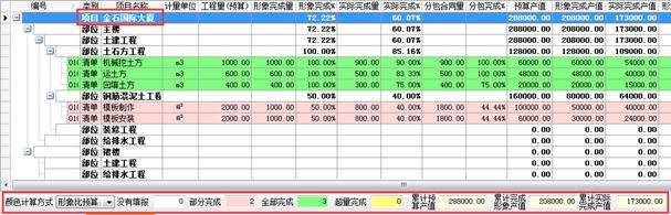 對于某些工程,高水平的項(xiàng)目經(jīng)理可以把實(shí)際完成量做小,需要的達(dá)到的效果是“實(shí)際干的進(jìn)度小于向甲方上報(bào)的進(jìn)度”。在金石軟件中能很好地體現(xiàn)“實(shí)際進(jìn)度”、“形象進(jìn)度”兩個(gè)概念,在進(jìn)度填報(bào)過程中可以將“實(shí)際進(jìn)度”、“形象進(jìn)度”分別填報(bào)。并且將清單“甲方合同量”、“分包合同量”、“形象完成量”、“實(shí)際完成量”四者的關(guān)系完全展現(xiàn)在一起。