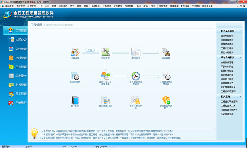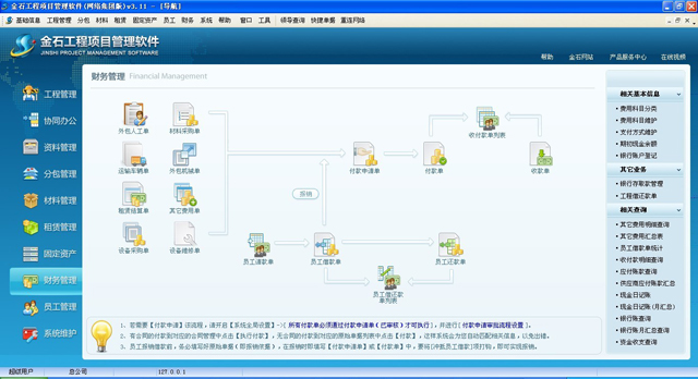 本軟件是金石軟件公司以眾多施工企業(yè)管理現(xiàn)狀為出發(fā)點(diǎn),深入了解施工現(xiàn)場,經(jīng)過七年地不斷完善與努力,打造成為一款成熟、靈活、實(shí)用性極高的信息化內(nèi)控管理平臺。軟件以成本控制為核心,以資金管理為主線,全面解決項(xiàng)目管理難題,提升項(xiàng)目管控能力。對工程的投標(biāo)管理、中標(biāo)后的進(jìn)度管理、分包管理、采購招標(biāo)、材料管理、租賃管理、固定資產(chǎn)管理、員工管理、勞務(wù)管理、資金管理、押金管理、發(fā)票管理、稅金核算、聯(lián)營管理、文檔資料管理、物資管理、安全質(zhì)量管理、證件管理、車輛管理、工程結(jié)算、等進(jìn)行全方位管理,并提供強(qiáng)大的OA功能,能夠?qū)崿F(xiàn)各部門之間的數(shù)據(jù)共享及業(yè)務(wù)單據(jù)網(wǎng)上簽批審核。并且提供了強(qiáng)大的自定義工作流驅(qū)動和各種流程開關(guān),企業(yè)可根據(jù)自己情況自行設(shè)定,從而規(guī)范企業(yè)管理、讓工作流程正歸化、簡單化。通過工作流,讓信息送審、審批更貼近日常公司管理模式,申請人可隨時(shí)看到當(dāng)前業(yè)務(wù)的審批進(jìn)度和各領(lǐng)導(dǎo)的審批意見。