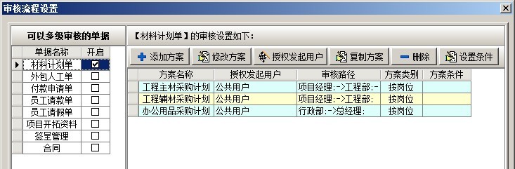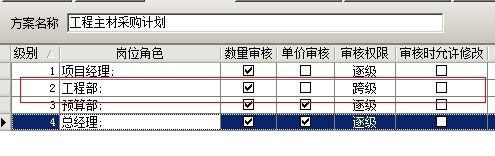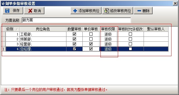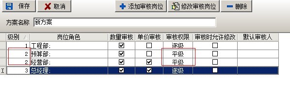 在多級審核中,可以設(shè)置多套審核方案,每套方案可設(shè)置多個(gè)崗位,可設(shè)置方案的授權(quán)發(fā)起用戶(在業(yè)務(wù)單據(jù)中選擇該審核方案的用戶)。在添加方案時(shí),有三種方式逐級審核、平級審核、跨級審核。逐級審核是指各個(gè)崗位按先后順序依次審核該業(yè)務(wù)單據(jù),例如審核順序?yàn)椋こ滩俊㈩A(yù)算部、經(jīng)營部、總經(jīng)理如下圖: