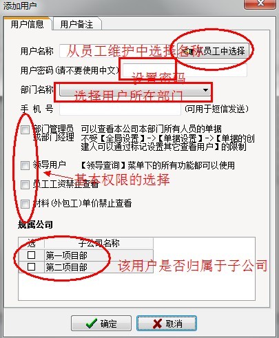 點擊添加用戶,在彈出的窗口中,依次添加好用戶信息,主要包含用戶名、密碼、所屬部門、所屬公司等。