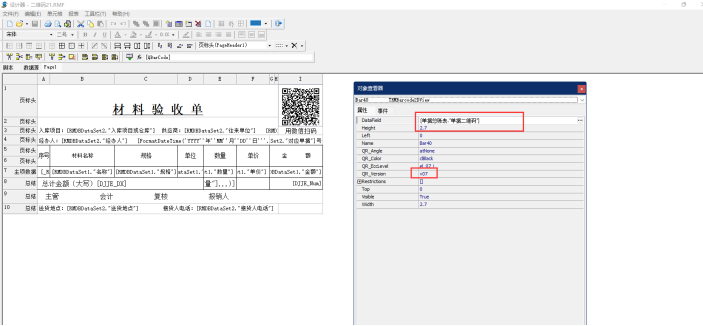 3、設置好二維碼樣式之后右鍵點擊單元格,點擊屬性。設置字符來源(datafield)為“[單據總賬表."單據二維碼"]”,二維碼版本(QR_vesion)為:v07