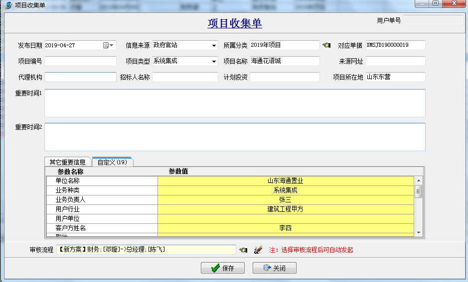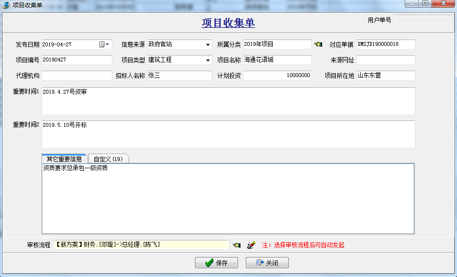 項目收集單:主要是用于項目投標前的收集,公司銷售人員將在“政府網站” 、“自己開拓”等項目前期信息歸檔并走相應的公司內審批流程,確定哪些項目我們可以去參與投標。
