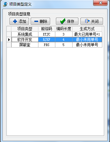 ①點“添加”按鍵增加豎列; ②“項目類型”輸入需要的項目類型; ③“前綴碼”列輸入自動流轉的項目編號; ④“編碼長度”列為不含前綴的數值長度;