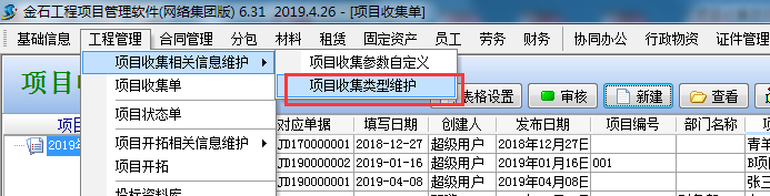 2、項目收集類型:菜單欄 “工程管理模塊”→“ 項目收集類型”