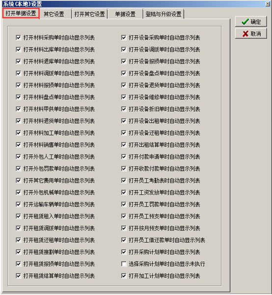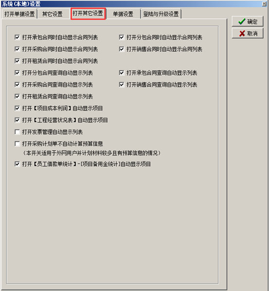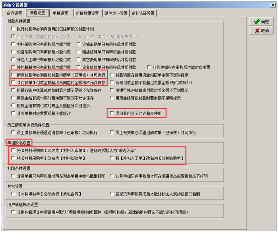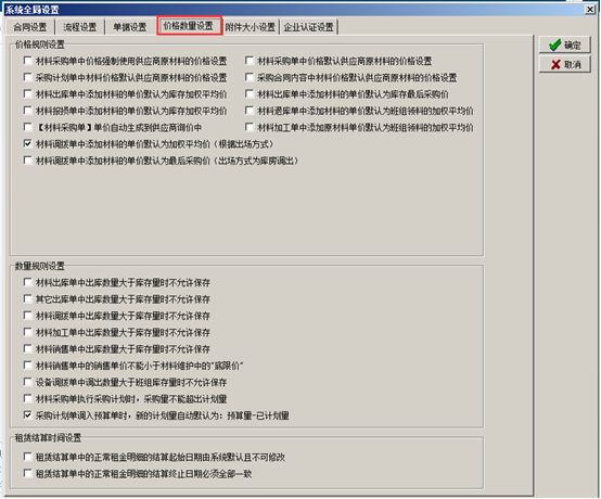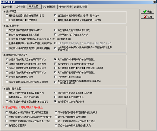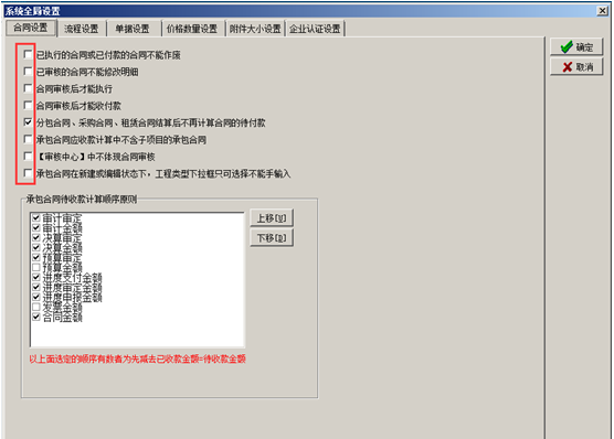 進入系統的“系統維護”-“系統全局設置”彈出系統全局設置的對話框,點擊“合同設置”,在對應的復選框打鉤代表合同受對應開關的控制,如圖: