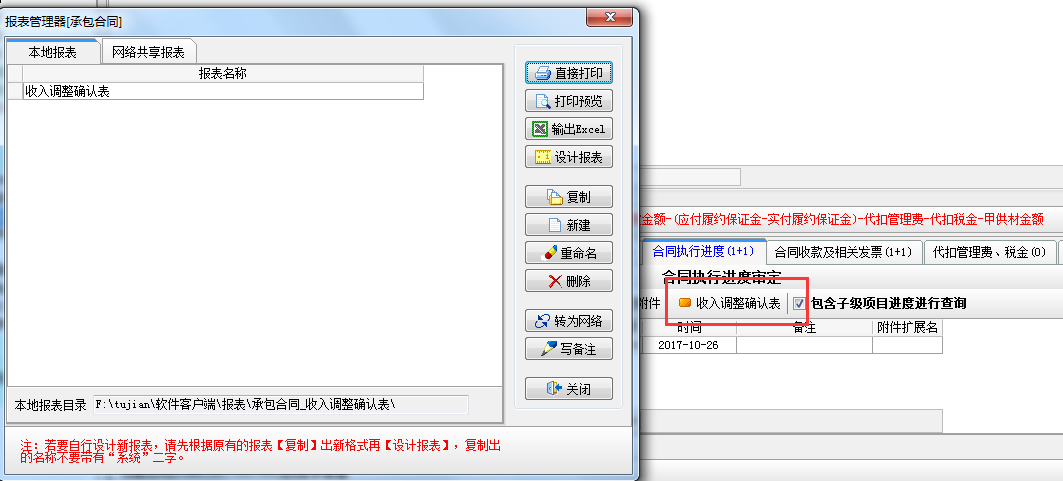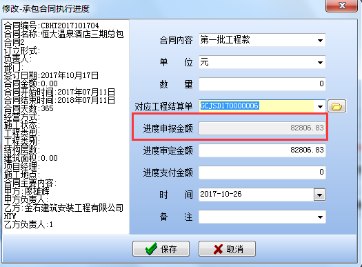 4.填寫“承包合同”執行進度,對應工程結算清單,(下圖)“進度申報金額”就是在工程結算單中填寫的暫估收款金額,“進度審定金額”就是報給甲方審定后的最終收入金額