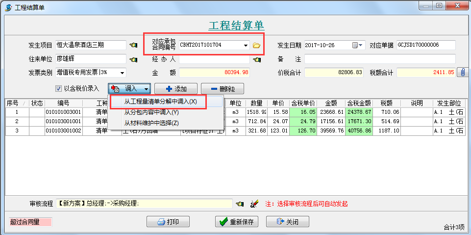 3.做工程結算單(暫估收入)對應承包合同編號,調入上圖中做好的“部位分解”中的清單內容