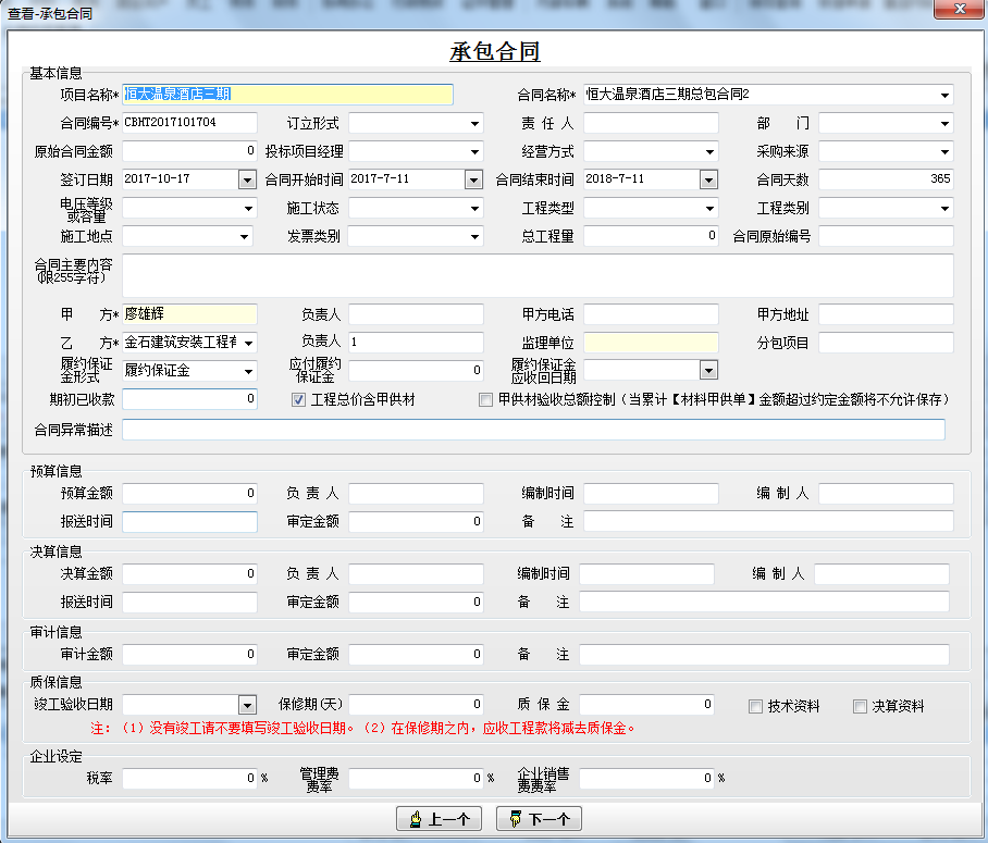 1.【工程管理】→【承包合同】 新建承包合同,選擇甲方、乙方等主要的合同內容信息