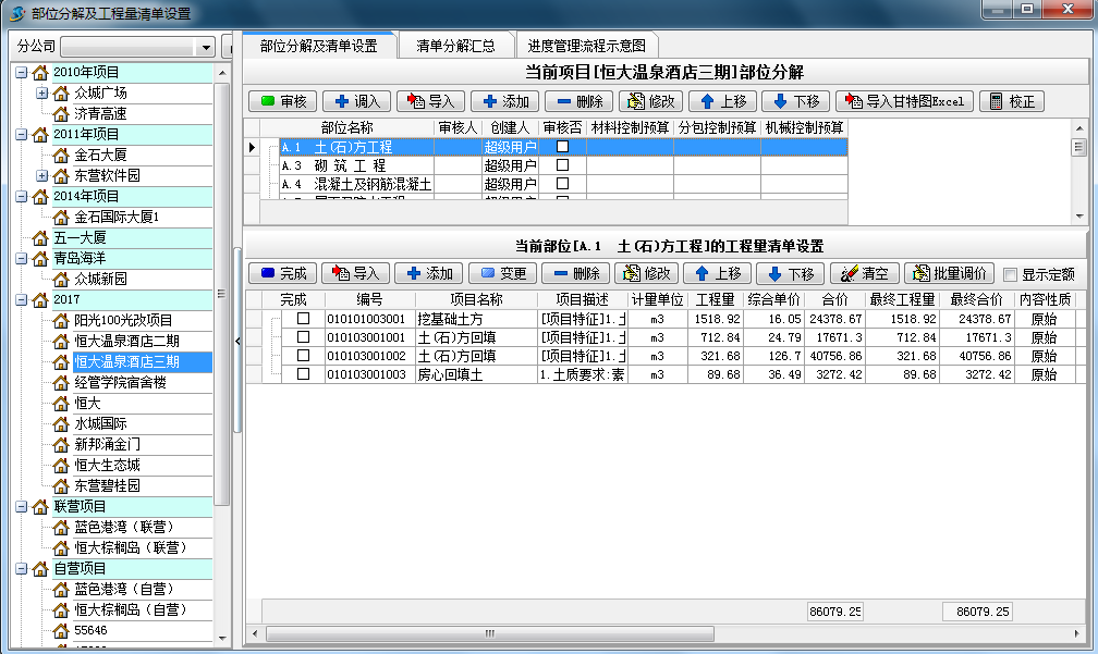 2.合同建立完成后,對項目進行部位的分解(支持導入廣聯達、智多星等主要清單軟件做出的工程量清單直接導入到軟件內,也可以根據軟件的格式編輯EXCEL表格進行導入)