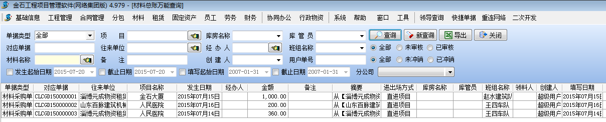 2.3.1設(shè)置項(xiàng)目隱藏前查詢時(shí)統(tǒng)計(jì)所有項(xiàng)目數(shù)據(jù),我們以材料總賬萬能查詢?yōu)槔缦聢D