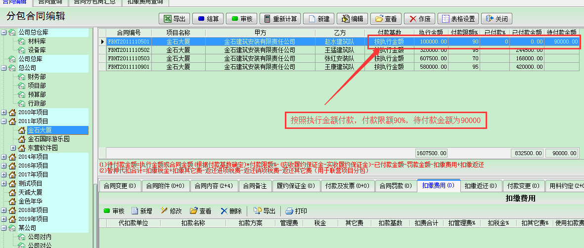 沖抵前截圖如下,合同以執行金額付款(10000),付款限額90%,待付款為90000.