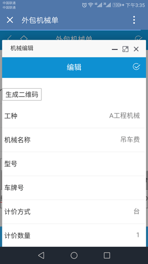 2、金石工程管理軟件手機(jī)端也可以生成二維碼,在配置好企業(yè)微信的前提下,進(jìn)入手機(jī)端的單據(jù)填寫并打開外包機(jī)械單,如圖所示