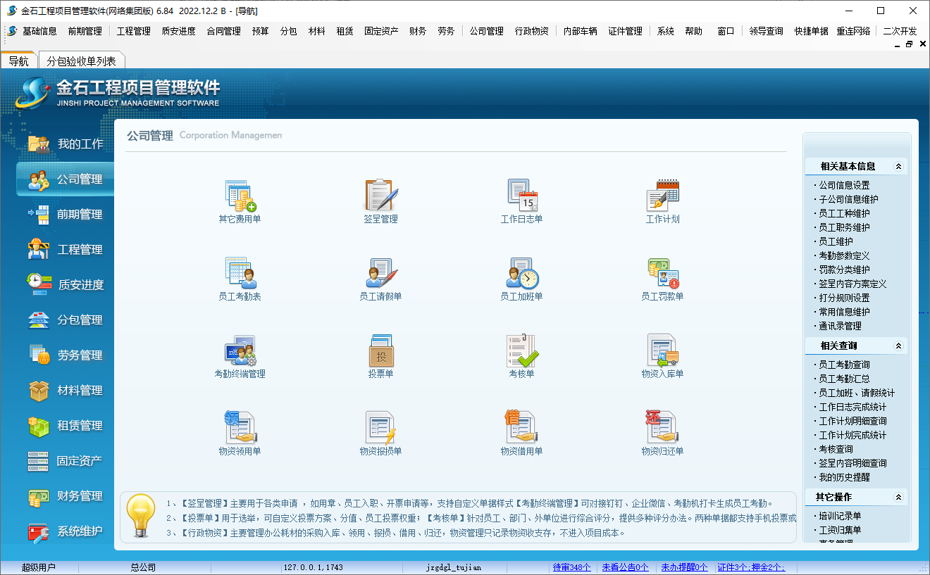 增加了公司管理,前期管理和勞務(wù)管理的導(dǎo)航模塊。公司管理模塊包括行政部門主要的管理內(nèi)容,如員工維護(hù)、員工考勤單、員工請(qǐng)假單、員工加班單、員工罰款單等員工管理的內(nèi)容;如物資入庫單、物資領(lǐng)用單、物資借用單、物資歸還單等行政物資的內(nèi)容;還增加了投票單和考核單的內(nèi)容。前期管理模塊主要包括項(xiàng)目收集單、項(xiàng)目開拓、投標(biāo)資料庫、報(bào)價(jià)資料庫和投標(biāo)人員業(yè)績(jī)查詢等內(nèi)容。勞務(wù)管理模塊主要是把原菜單的內(nèi)容添加進(jìn)來,讓導(dǎo)航模塊內(nèi)容更充實(shí)。