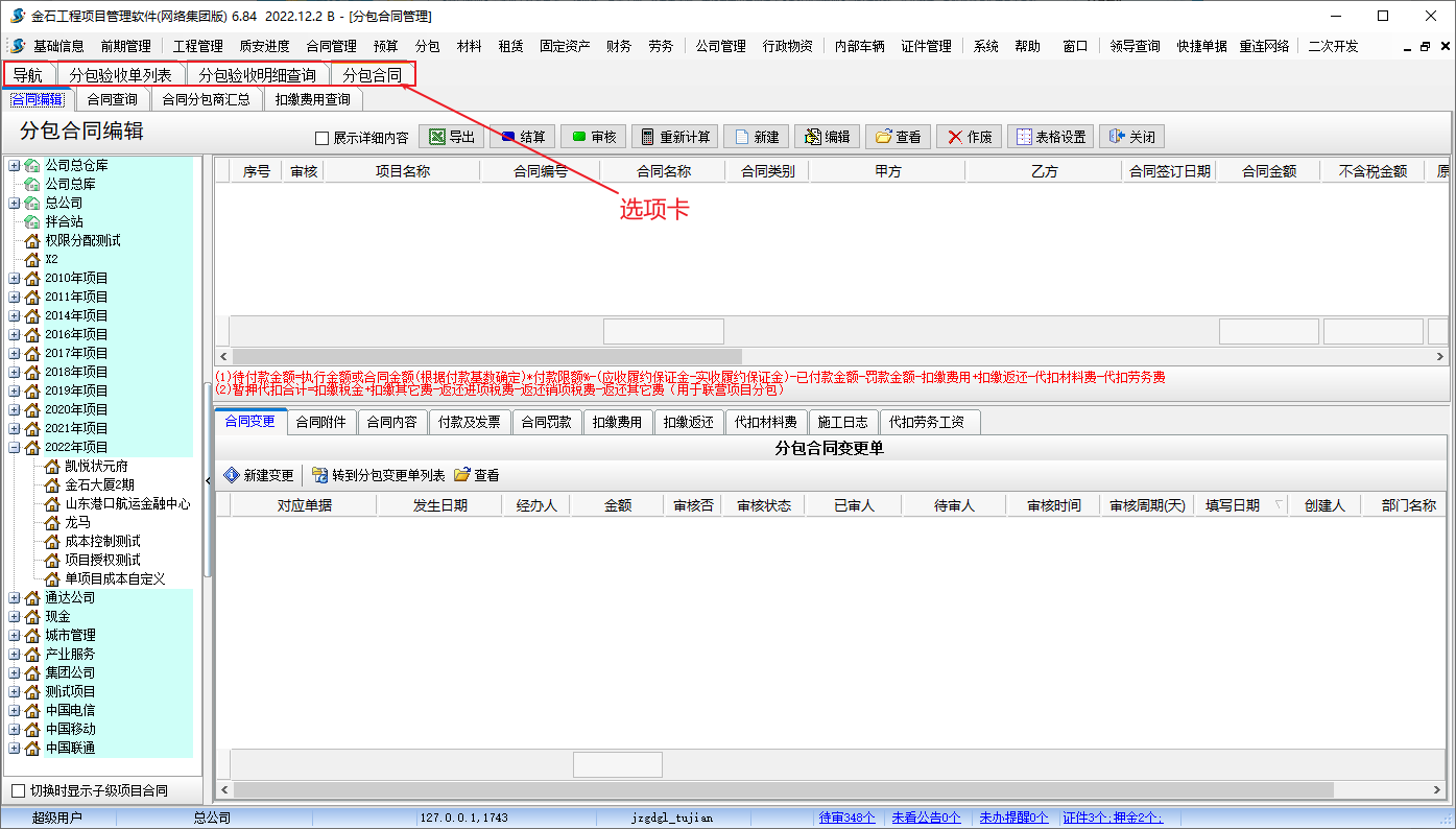 金石工程管理軟件新增導(dǎo)航、所有單據(jù)列表和合同新增選項(xiàng)卡的布局設(shè)置