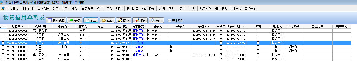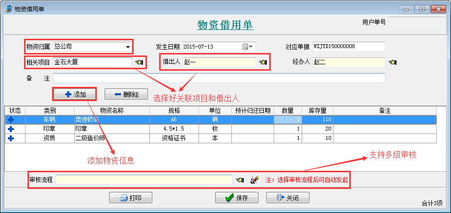 點(diǎn)擊主菜單中的【行政物資】->【物資借用單】打開物資借用單列表 點(diǎn)【新建】按鈕,錄入如下: