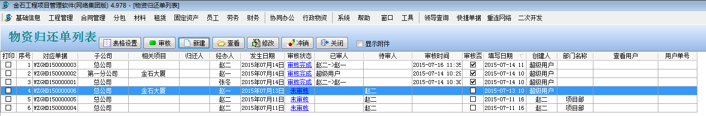 點(diǎn)擊主菜單中的【行政物資】->【物資歸還單】打開(kāi)物資歸還單列表 點(diǎn)【新建】按鈕,錄入如下: