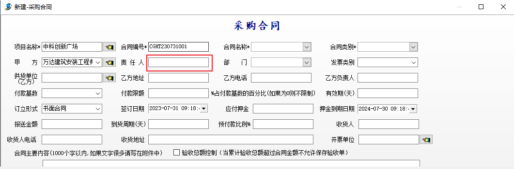 2、采購合同新建時,責任人留空,不再帶入上次記錄內(nèi)容。