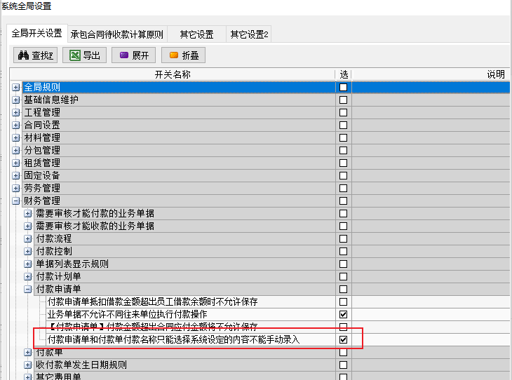 3、付款申請單和付款單付款名稱只能選擇系統(tǒng)設(shè)定的內(nèi)容不能手動錄入”