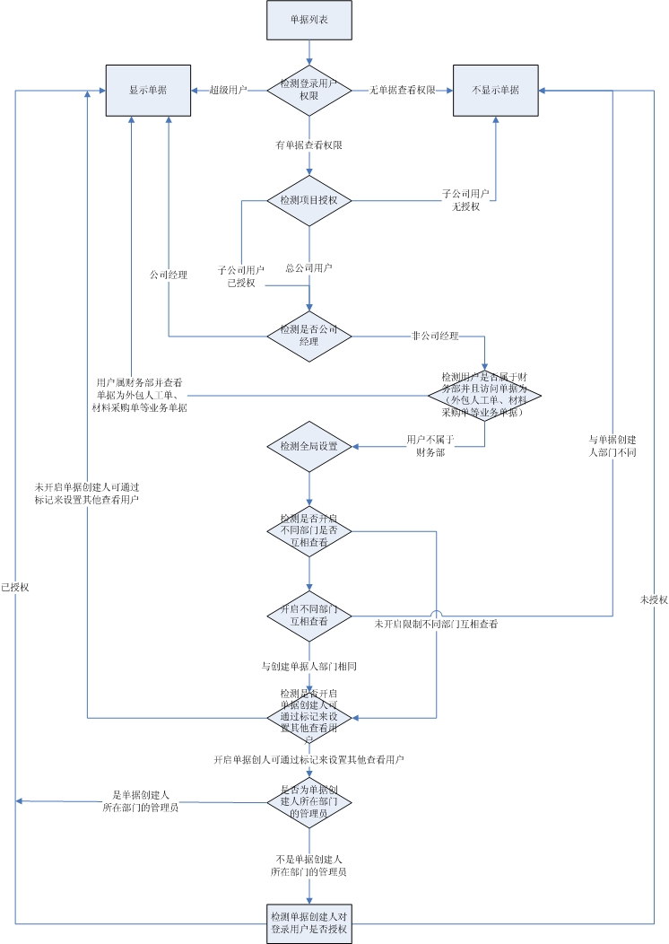 (3)材料采購(gòu)單、材料銷售單、材料退貨單、外包人工單、外包機(jī)械單、運(yùn)輸車輛單、租賃結(jié)算單、其它費(fèi)用單、設(shè)備采購(gòu)單、設(shè)備維修單、設(shè)備退貨單、付款申請(qǐng)單、付款單、收款單 (涉及財(cái)務(wù)的這14個(gè)單據(jù)) 對(duì)于【財(cái)務(wù)部】也不受該條件限制,可以查看所有部門單據(jù)。