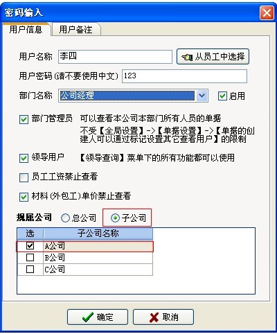 如上圖:李四規(guī)屬于A公司,是【公司經(jīng)理】可以看到A公司的所有部門、所有授權(quán)項(xiàng)目有關(guān)的單據(jù)。