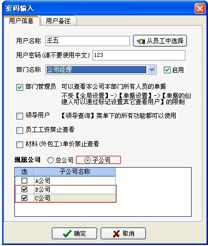 如上圖:王五規(guī)屬于B、C公司,是【公司經(jīng)理】可以看到B、C兩個(gè)公司的所有部門、所有授權(quán)項(xiàng)目有關(guān)的業(yè)務(wù)單據(jù)。