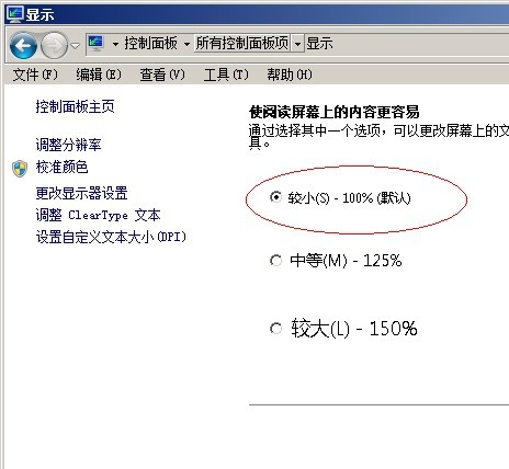 3. 在彈出的顯示窗口中選擇【較小S 100%(默認)】根據提示重啟系統后,界面就會顯示正常。