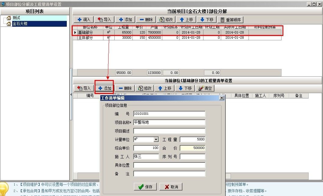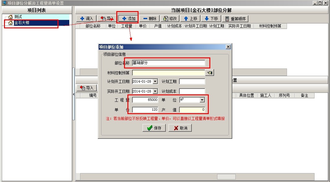 選中項目,點當前項目部位分解的添加,彈出添加窗口,填寫部位名稱、工程量、單位等相關信息,多個部位需要多次添加。也可以使用簡單方法,做好EXCEL電子表格,導入